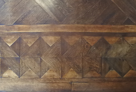 - 床には寄せ木のフローリングやタイルを使用、ドアは楓の一枚板の木製建具に模様。